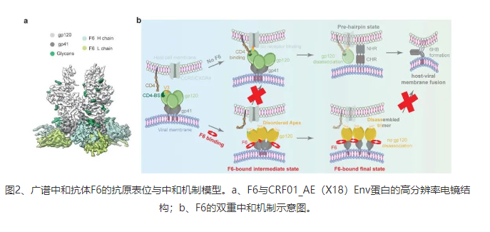 F6是第一株分離自CRF01_AE感染個體的廣譜中和抗體。研究團隊還通過高分辨率冷凍電鏡結(jié)構(gòu)解析揭示了F6在Env蛋白上的詳細抗原表位(圖2a),并進一步通過結(jié)構(gòu)分析與功能實驗驗證闡明了F6的新型中和機制(圖2b):F6一方面通過變構(gòu)效應(yīng)擾動Env蛋白三聚體Apex區(qū)域的穩(wěn)定性,破壞Env蛋白與宿主CD4受體的結(jié)合,另一方面通過誘導(dǎo)三聚體的解體來阻礙Env蛋白介導(dǎo)的病毒包膜與細胞膜的融合,進而抑制病毒對于宿主的入侵(圖2b)。