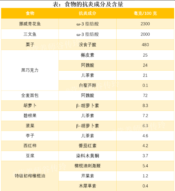 抗炎飲食可以改善體內(nèi)的炎癥因子,避免發(fā)展出疾病。比如:碳水化合物:推薦全谷物碳水化合物,比如藜麥、糙米、蕎麥、黑米等等。脂肪:多選擇單不飽和脂肪酸和多不飽和脂肪酸,比如魚蝦、貝類、亞麻籽油等含有多不飽和脂肪酸、歐米伽-3型脂肪酸。蛋白質(zhì):選優(yōu)質(zhì)蛋白質(zhì),如魚、家禽、雞蛋、瘦紅肉,以及低脂乳制品和大豆食品。蔬果:十字花科蔬菜和莓果類是最被推薦的“抗炎選手”。富含多酚、黃酮的食物:如綠茶、大豆等;香辛料:如姜黃、生姜、肉桂、肉蔻、大蒜等等在“抗炎飲食”榜上有名。⑥2023年5月國家注冊營養(yǎng)師谷傳玲根據(jù)文獻研究,整理出了12種“抗炎王者食物”,供大家日常飲食中參考。